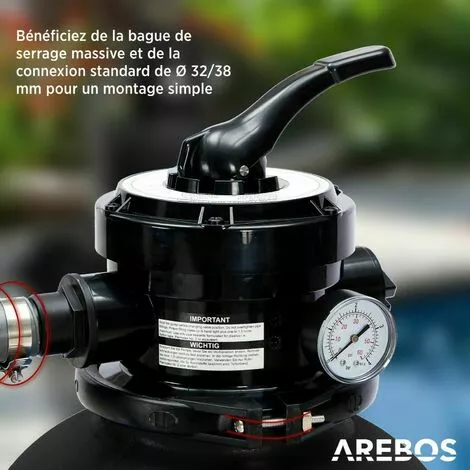 Le modèle de système de filtration à sable AREBOS dispose en standard de raccords pour tuyaux de piscine d’un diamètre compris entre Ø 32 et 38 mm. Cela signifie que vous pourrez connecter pratiquement toutes les piscines disponibles dans le commerce. La cuve du filtre est reliée à la vanne à 4 voies par une bague de serrage solide et de qualité testée.