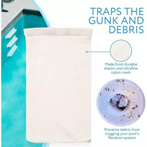 - Coupe universelle : les chaussettes Skimmer peuvent être utilisées avec la plupart des paniers de skimmer de piscine.FACILE À UTILISER: Installez en quelques secondes, glissez simplement la chaussette sur le panier et elle est prête à collecter les débris de l’eau.