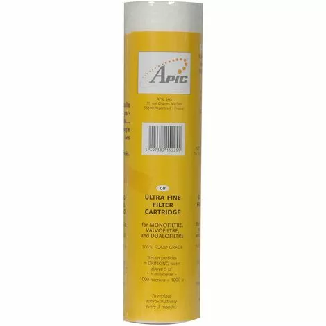 Cette cartouche filtrante ultrafine, thermosoudée (Meltblown), 100 % qualité alimentaire, est destinée à la filtration ultrafine des particules d’un diamètre supérieur à 5 microns en suspension dans l’eau, telles que l’argile, la rouille, les particules de tartre et le sable. La technologie Meltblown permet d’éviter que les sédiments ne soient à nouveau libérés. Cette cartouche convient pour les modèles V10 et D10B super. Il est recommandé de remplacer la cartouche tous les 2 mois en moyenne ou lorsqu’elle est sale.