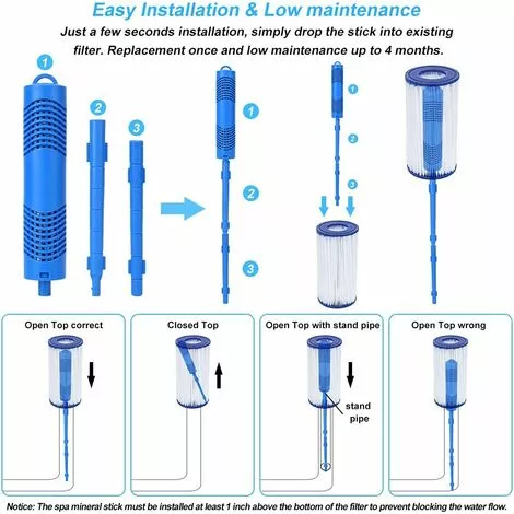 【FACILE À UTILISER ET À REMPLACER】 Placez simplement les pièces du bâton minéral dans votre filtre de spa ou votre panier d’écumoire et laissez-les faire leur travail, aucun autre processus compliqué n’est nécessaire. 2 pièces pratiques à remplacer à temps. (Recommandé de le remplacer une fois tous les 3-4 mois.)