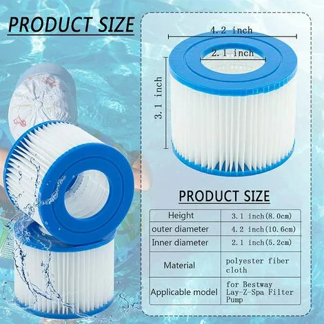 [Filtre à éléments filtrants pour piscine VI Bestway] : hauteur : 3,1 pouces/80 mm, diamètre extérieur : 4,2 pouces/106 mm, diamètre intérieur : 2,1 pouces/52 mm. Applicable à la baignoire de massage de la série Lay-Z-Spa – veuillez confirmer le modèle de pompe avant d’acheter.[Filtration haute efficacité] : le filtre à cartouche VI est installé dans la pompe à filtre pour collecter la saleté lorsqu’elle passe dans le système, aider à éliminer la saleté et les bactéries et vous fournir de l’eau propre et fraîche.[Élimination des impuretés] : le filtre de la piscine de massage est en papier polyester facile à nettoyer et durable. La saleté est facilement lavée. Le filtre à élément filtrant VI peut empêcher les bactéries de se multiplier, empêchant ainsi la pollution secondaire.[Facile à nettoyer] : retirez simplement le filtre de la pompe, puis rincez la saleté avec un tuyau d’arrosage. Veillez à ne pas nettoyer grossièrement ou à utiliser un pistolet à eau à haute pression, car cela pourrait endommager le papier filtre.[Remplacer ou nettoyer] : remplacez par un nouvel élément filtrant toutes les deux semaines pour de meilleurs résultats – si nécessaire, il est facile à nettoyer, frottez avec un outil de nettoyage d’élément filtrant, puis nettoyez sous une forte pression d’eau pour éliminer les particules libres sur le Mscomft tissu filtrant.