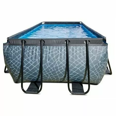 EXIT Stone zwembad 540x250x122cm met filterpomp – grijs Het EXIT Stone zwembad 540 x 250 x 122 cm is een rechthoekig grijskleurig frame zwembad. Dit grote zwembad is standaard voorzien van een filterpomp en een zwembadtrap, waarmee je veilig het zwembad in en uit kunt stappen. Het frame zwembad biedt genoeg ruimte om heerlijk op een luchtbed te dobberen. En wil je toch liever onder water zwemmen? Het EXIT Stone zwembad is maar liefst 122 centimeter diep waardoor je echt onder water kunt duiken. Met het hoogwaardige frame zwembad van EXIT Toys beleef je gegarandeerd de leukste wateravonturen in je eigen tuin! Een frisse duik in je zwembad! Het Stone zwembad heeft een modern en stoer steenpatroon op de zijkant en is daarmee een échte blikvanger in de tuin. Het EXIT zwembad is uitgevoerd met sterke 3-laags wanden van PVC en polyester en de binnenzijde van het zwembad is blauw voor het frisse zwembadgevoel. Het zwembad is geschikt voor maar liefst negen personen en omdat het zwembad diep is, kun je ook baantjes trekken en onder water duiken. De meegeleverde filterpomp houdt het water fris en in beweging zodat vervuiling van het water wordt tegengegaan. De filterpomp kan eenvoudig aan het zwembad worden gemonteerd en door middel van filtercartridges wordt het water ververst. Stabiel en sterk! Het frame zwembad is niet alleen uniek, maar ook stabiel en sterk. Het stalen zwarte frame van het zwembad is extra dik met een diameter van 50 mm en de frame-poten zorgen voor optimale stabiliteit, zodat het zwembad altijd stevig blijft staan. Natuurlijk is er ook aan duurzaamheid gedacht: het zwarte frame is gegalvaniseerd en gepoedercoat zodat roest geen kans maakt. Het Duplex Coating Systeem noemen we dat bij EXIT Toys. Tijd voor een frisse duik in je eigen EXIT zwembad in de tuin! Standaard inbegrepen – Zwart stalen zwembadframe 540 x 250 x 122 cm – Grijze liner met stoer steenpatroon – Inclusief filterpomp met cartridge- Inclusief trapje- Inclusief liner reparatieset – Handleiding framebad- Handleiding pomp – Handleiding ladder EXIT tip: voor extra reiniging wordt het gebruik van chloortabletten aanbevolen.