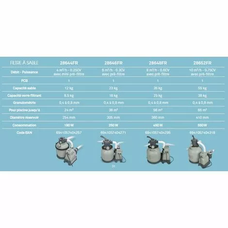 FILTRE À SABLE 28646FR.Débit – Puissance : 6 m³/h – 0,3CV.Capacité sable : 23 kg.Capacité verre filtrant : 16 kg.Granulométrie : 0,4 à 0,8 mm.Pour piscine jusqu’à 36 m3.Diamètre réservoir : 305 mm.Consommation : 250 W.