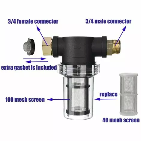 Le kit de filtre à eau comprend un filtre de tuyau en ligne (écran à 40 mailles), un écran de 100 mailles, 2 rondelles de tuyau et 3 rondelles de filtre.