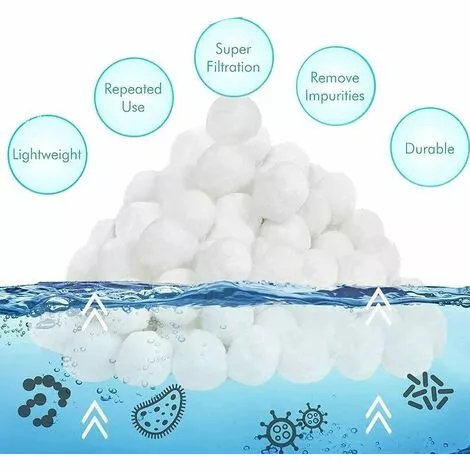 [Boule filtrante très polyvalente] Un seul filtre de 50 cm de diamètre ; poids total : 700 g peut remplacer 25 kg de sable filtrant. La boule filtrante est généralement applicable à la plupart des nettoyeurs de piscine à chaudière filtrante. Il convient également aux pompes de filtration de saumure à sable.[Matériau de la boule filtrante] : la boule filtrante de la piscine est composée à 100 % de polyéthylène, qui est recyclable, flexible, non toxique et stable. Poids : 700 grammes, pouvant remplacer 25 kilogrammes de sable filtrant.[Super durable, recyclable]: Absorption élevée de la poussière, perméabilité à l’eau élevée, filtration plus légère et plus efficace, respectueux de l’environnement et recyclable. Longue durée de vie et économie d’énergie. Il présente les avantages d’une résistance élevée à la filtration, d’une vitesse de filtration rapide, d’une longue durée de vie, d’une bonne flexibilité lors d’une utilisation répétée et d’une faible perte.[Boule filtrante simple et efficace] Coulée sur la machine, elle convient également à votre système de filtre à sable. La boule filtrante est facile à utiliser et peut être utilisée dans n’importe quel système de filtre à sable courant pour obtenir facilement un excellent effet de filtre.[Une large gamme de boules filtrantes réutilisables pour piscine] : nos boules filtrantes sont généralement applicables à presque tous les nettoyeurs de piscine dans la piscine filtrante. Il convient également aux pompes de filtration de saumure à sable. Largement utilisé dans les piscines, les aquariums, les pompes filtrantes, le sable filtrant et d’autres médias.