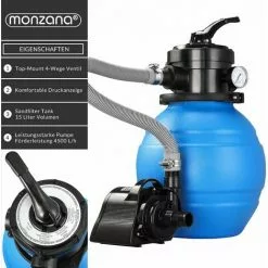En vertu du sable comme milieu filtrant, ce filtre à sable de piscine est efficace pour filtrer et purifier l’eau de votre piscine. Il s’agit d’une option très économique et nécessitant peu d’entretien pour garder l’eau de votre piscine intacte. Fabriqué en polyéthylène haute densité, le filtre à sable est hautement durable. Ce filtre est conçu pour atteindre un débit de 7 m³/h. La pression de service maximale est de 3,5 bar. Pour démarrer l’opération, 19 kg de sable filtrant (non inclus) sont nécessaires. Le filtre est équipé d’une vanne multivoie à 4 positions : filtre (pour filtrer l’eau), contre-lavage (pour nettoyer le milieu filtrant), rinçage (pour rincer le système de filtration) et hiver (pour hiver). Remarque : Il peut être connecté avec des tuyaux de 32 mm et 38 mm de diamètre.