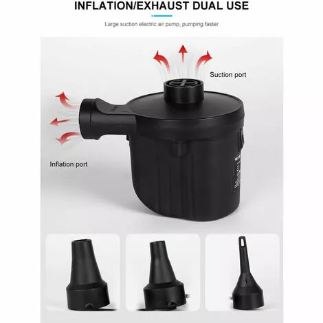 : Gonflez/dégonflez facilement avec vos pompes à matelas pneumatiques électriques. Placez la tête gonflable sur la cale de remplissage, puis appuyez sur l’interrupteur que vous pouvez gonfler. Mettez la tête gonflable dans le trou d’aération, puis appuyez sur l’interrupteur que vous pouvez dégonfler