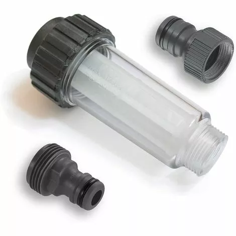 « Contenu de la livraison : 1 filtre à eau avec 2 adaptateurs rapides (1 x filetage intérieur + 1 x filetage extérieur) Domaines d’utilisation : protection optimale des pompes et des buses lorsque vous utilisez vos appareils avec de l’eau de pluie, des citernes, des fontaines, des bassins de rétention ou des canalisations d’eau plus anciennes. Le filtre filtre les saletés, les matières en suspension et les impuretés à partir d’une taille de 0,25 mm.Flexible : le filetage de raccordement de 3/4″ » permet une utilisation polyvalente. Que ce soit sur le nettoyeur haute pression ou la pompe de jardin pour protéger la pompe. Ou dans le tuyau d’arrosage pour éviter les buses obstruées des outils d’arrosage.Application : la grande surface de filtre garantit un débit optimal. Un contrôle optique est possible à tout moment grâce au boîtier de filtre transparent. En cas de salissure élevée, le filtre peut être facilement démonté sans outils. Convient pour : Kärcher 4.730-059.0 – pour nettoyeurs haute pression des séries K2 K3 K4 K5 K6 K7 // Nilfisk 128500674.Couleur : NoirPoids : 50g »