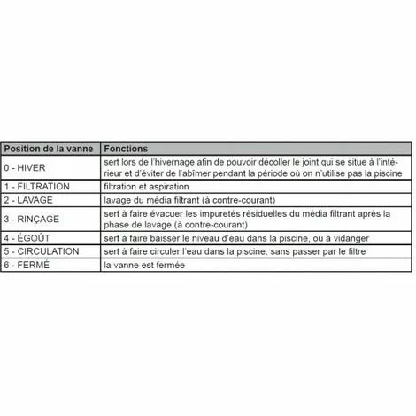 - Positions de la vanneHiver – Filtration – Lavage – Rinçage – Egout – Circulation – Fermée